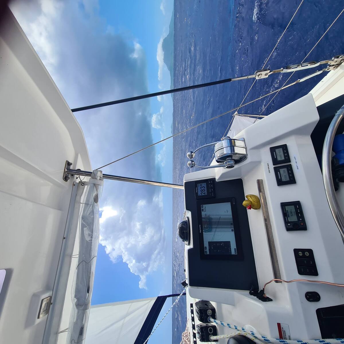 Our first task was crew training. Since several of us were new to sailing, we spent the first hours practicing the basics. Everyone took turns at the helm, learning how to steer, keep a steady course, and change direction smoothly. We also practiced how to stop the boat safely and how to maneuver in reverse — a bit tricky at first! Because it was a catamaran, we trained how to pivot on the spot using only the two engines, an essential skill for docking and tight spaces. These exercises helped the crew get comfortable with the boat and start working together as a team.