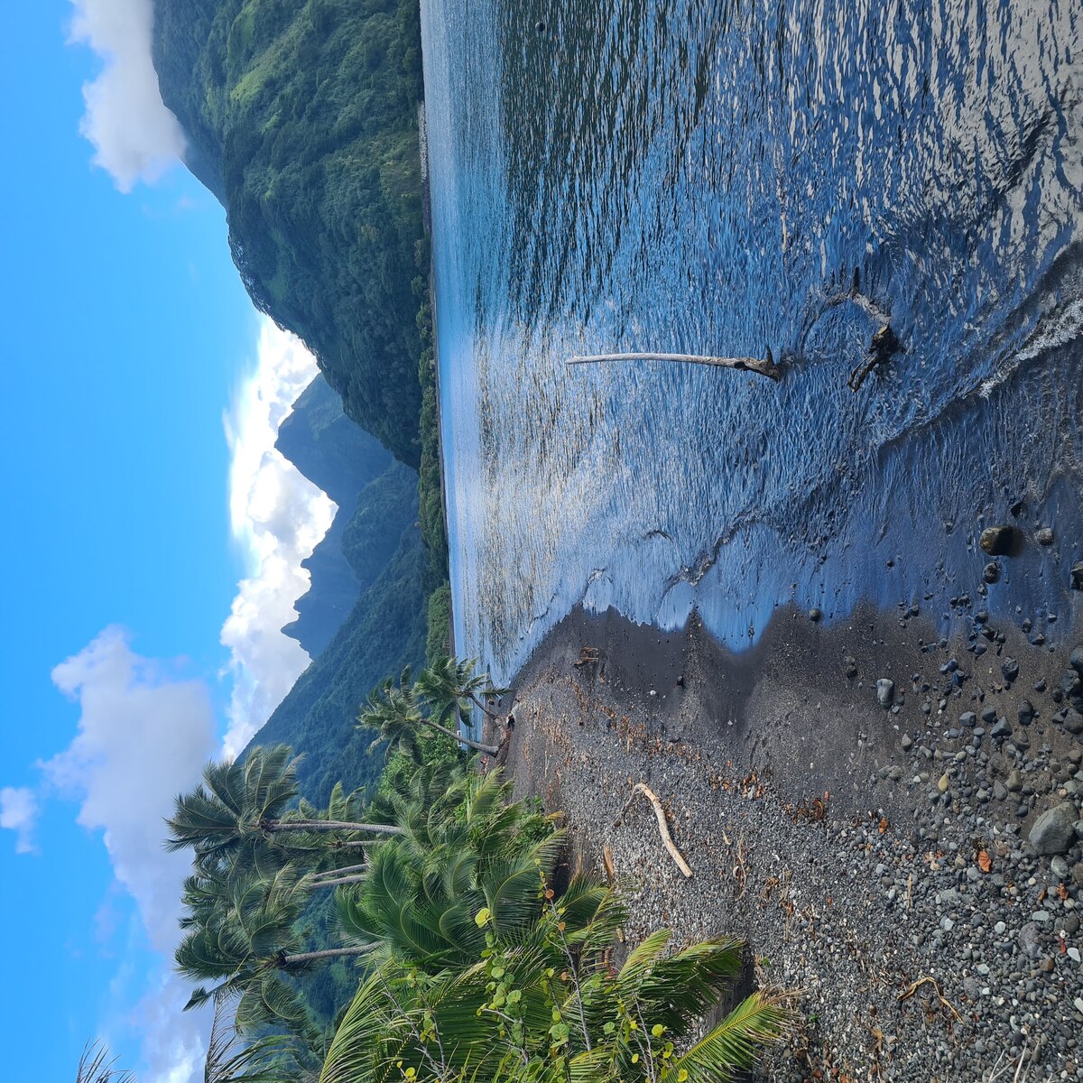 Later, we reached Tahiti Iti, the smaller and wilder peninsula of the island. There, near the famous Teahupo’o surf spot, we found a quiet beach with striking black volcanic sand — the only one of its kind we saw on the island. We skipped the surf trips and spent the afternoon snorkeling instead, spotting stingrays, breaching whales offshore, and schools of colorful fish in the clear water.